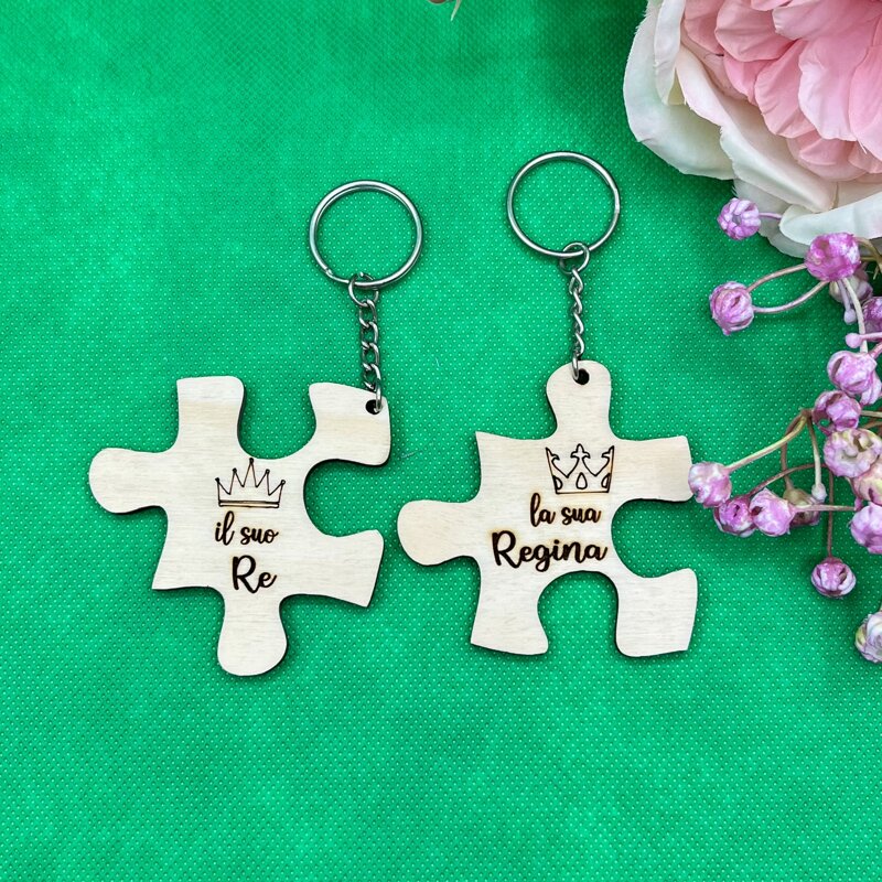 Coppia di portachiavi a forma di puzzle con gancetto e catena metallica come in foto.